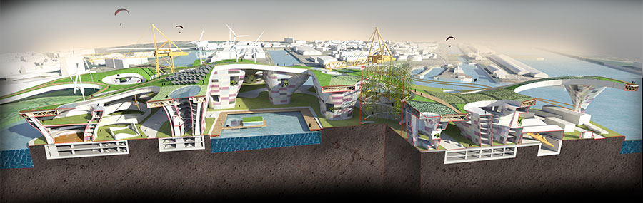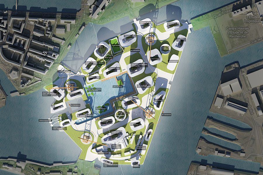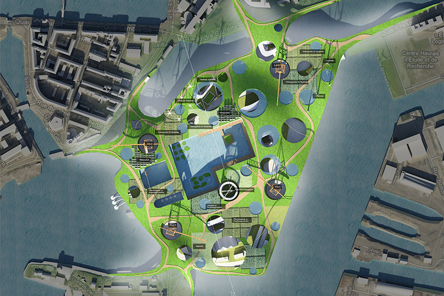 This project deals with an Island in the Harbor City Le Havre in French Normandy. The location of the island is between the UNESCO city center and the Petrol Productions and it’s storage site of the harbor. The function of the island is a parking lot for the cars waiting for the incoming and outgoing cruise ships. The new function of the island should consist of: an university with the emphasis on sustainability, engineering and economics, an advanced technical-research-center researching about future technologies and an additional center researching alternative energy supplies. The whole area has a second “green layer” – a green roof as a park and gardens for the students and an area for photovoltaic panels. Because of the programmatic diversity and the intense research for Future advances the name “Atoll of Eden” was chosen.